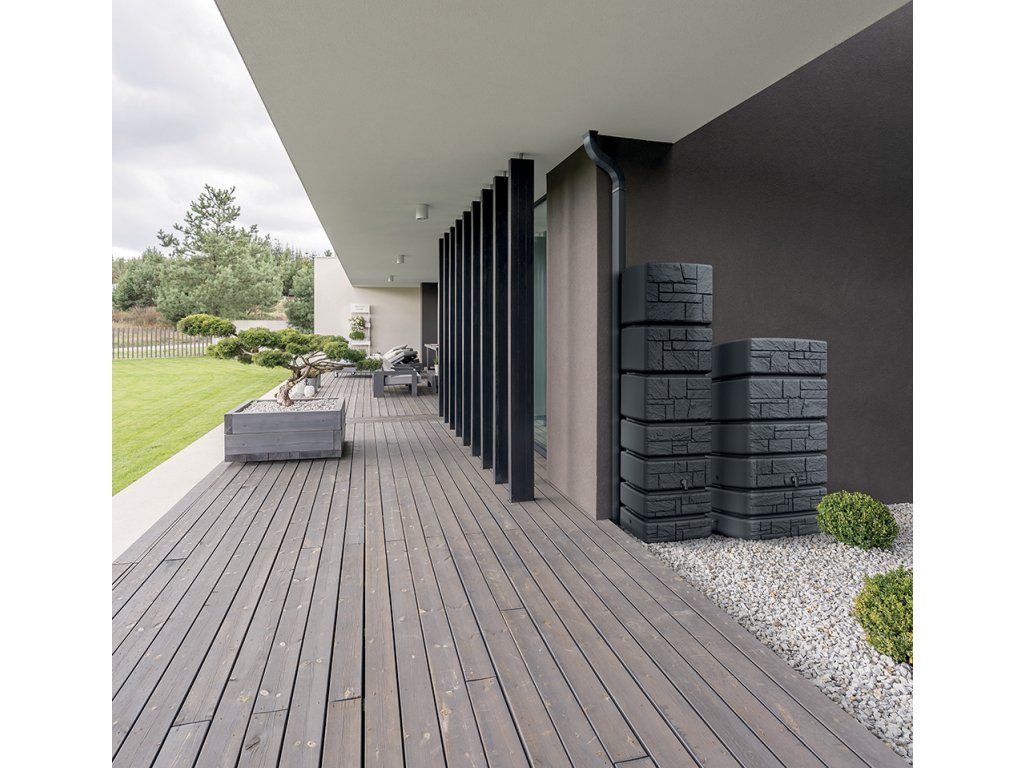 Sud Waterform Tower Stone se díky svému krásnému dekorativnímu designu hodí i k domům a zahradám s moderní architekturou. Motiv na přední straně sudu totiž napodobuje strukturu kamene v neutrální barvě. Horní kryt chrání obsah sudu před nečistotami, jako je listí ze stromů, pyl a prach.
