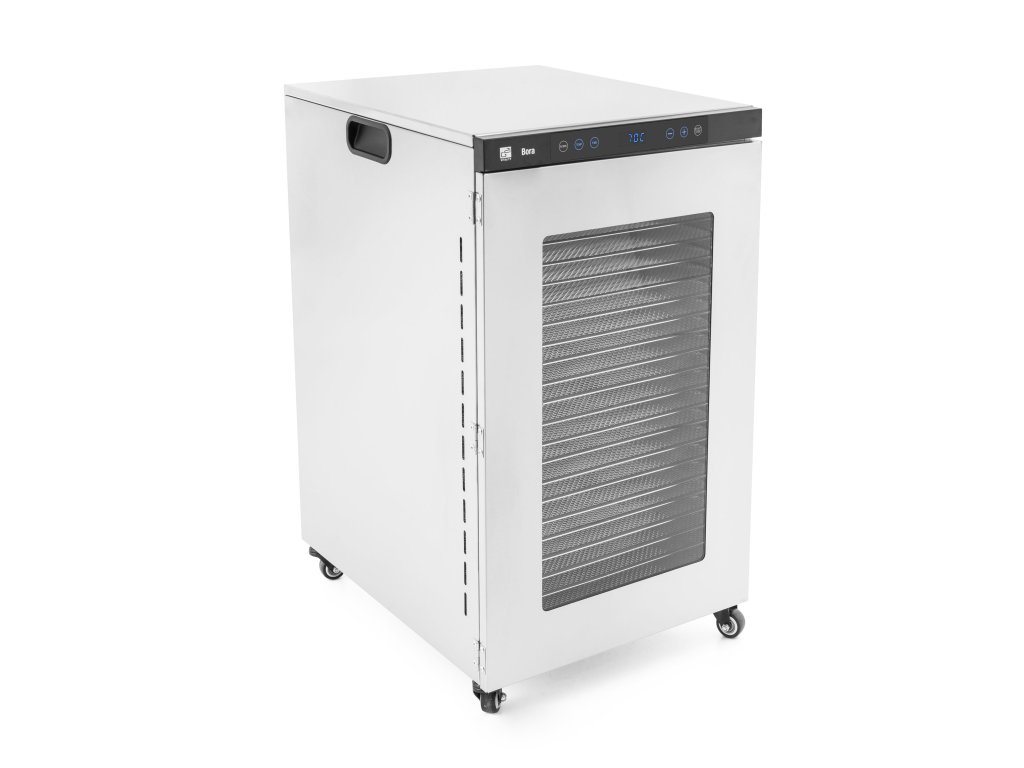 Vyrobili jsme ji převážně z nerezu. Tělo i 20 sušících plat. Nerez je zdravotně nezávadný, snadno se čistí a přitom zvládne i každodenní zátěž v kuchyni nebo provozu. Matný kov v kombinaci se skleněným okénkem působí moderně, čistě a sušičce Bora opravdu sluší.