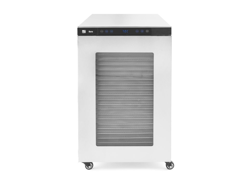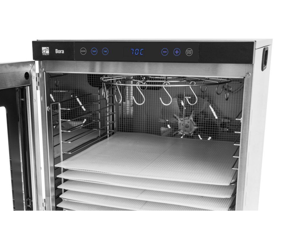 K sušičce Bora jsme přibalili 20 nerezových sušících plat a 20 vložek s jemným síťováním, které vám usnadní sušení drobných surovin. Na digitálním ovládacím panelu nastavíte potřebnou teplotu od 35°C do 75 °C, zvolíte čas sušení (až 48 hodin) a dál se o nic nestaráte. Po ukončení nastaveného programu se přístroj automaticky vypne.