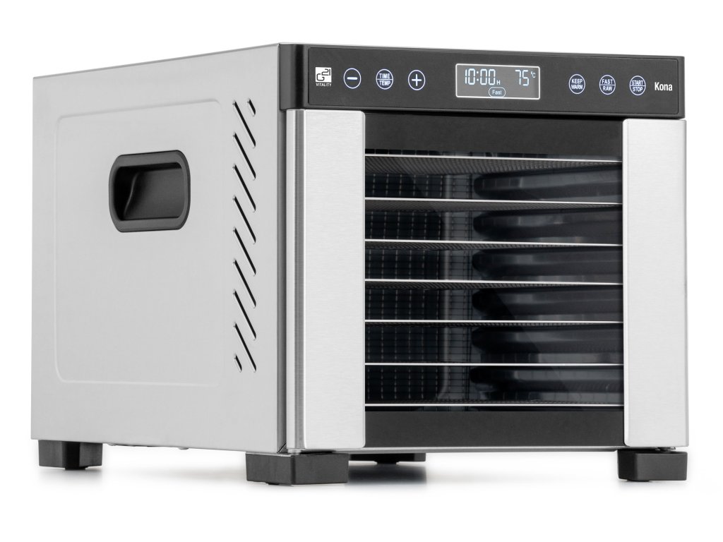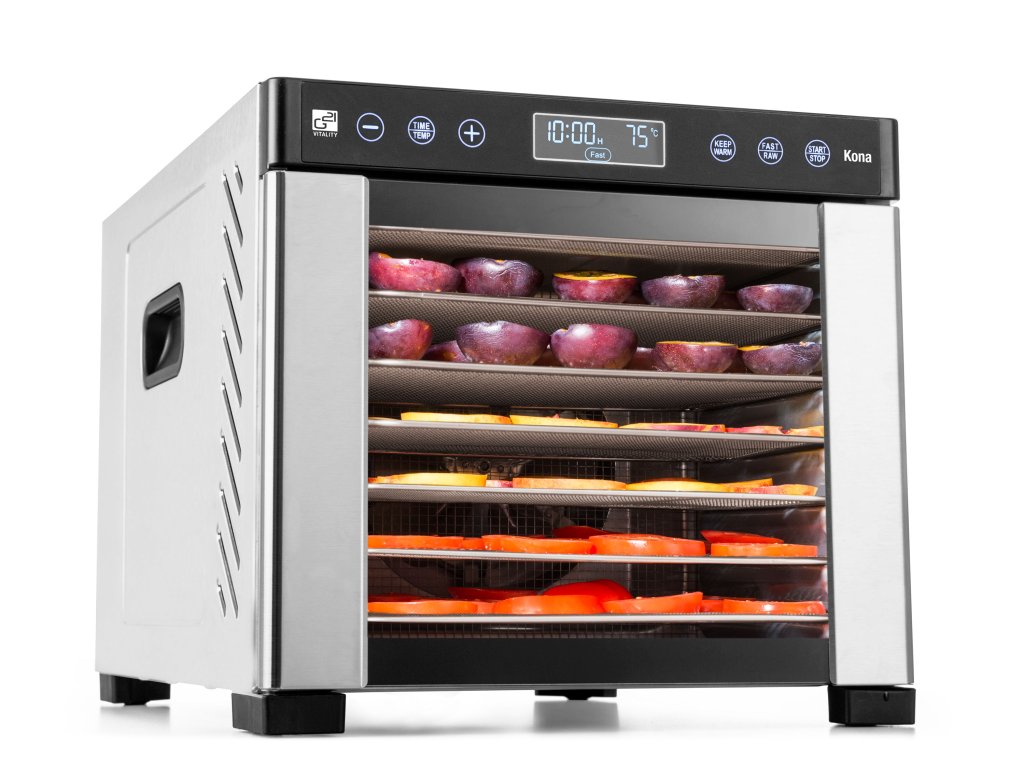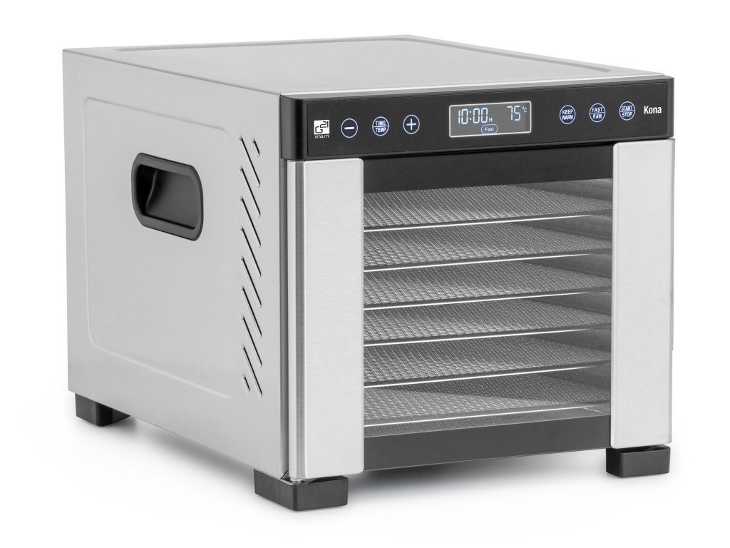 Sucho už má v názvu a svými schopnostmi i výkonem vás tato kompaktní sušička rozhodně překvapí. Pokud jste si při výběru sušičky potravin došli k názoru, že hledáte spíš menší sušičku, zato ale s profesionálními vlastnostmi i provedením, Kona je přesně tou pravou sušičkou ovoce, zeleniny, hub, masa i bylinek pro vás.