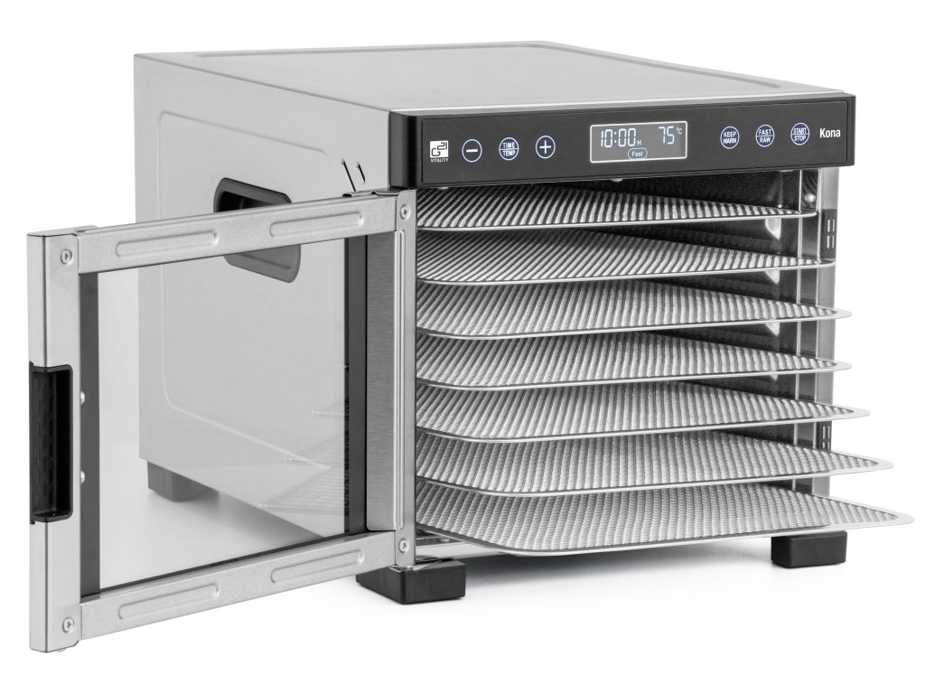 Zatímco u jiných sušiček v této cenové kategorii je ventilátor umístěný na spodní části, takže plata se sušenými surovinami musíte pro lepší usušení přesouvat, Kona je svým provedením o třídu výš. Díky strategicky umístěnému ventilátoru v ní proudí vzduch horizontálně. Dvířka s okénkem na čelní straně navíc zajišťují nižší spotřebu energie, dokonalou cirkulaci vzduchu, efektivnější sušení a zkracují dobu sušení potravin.
