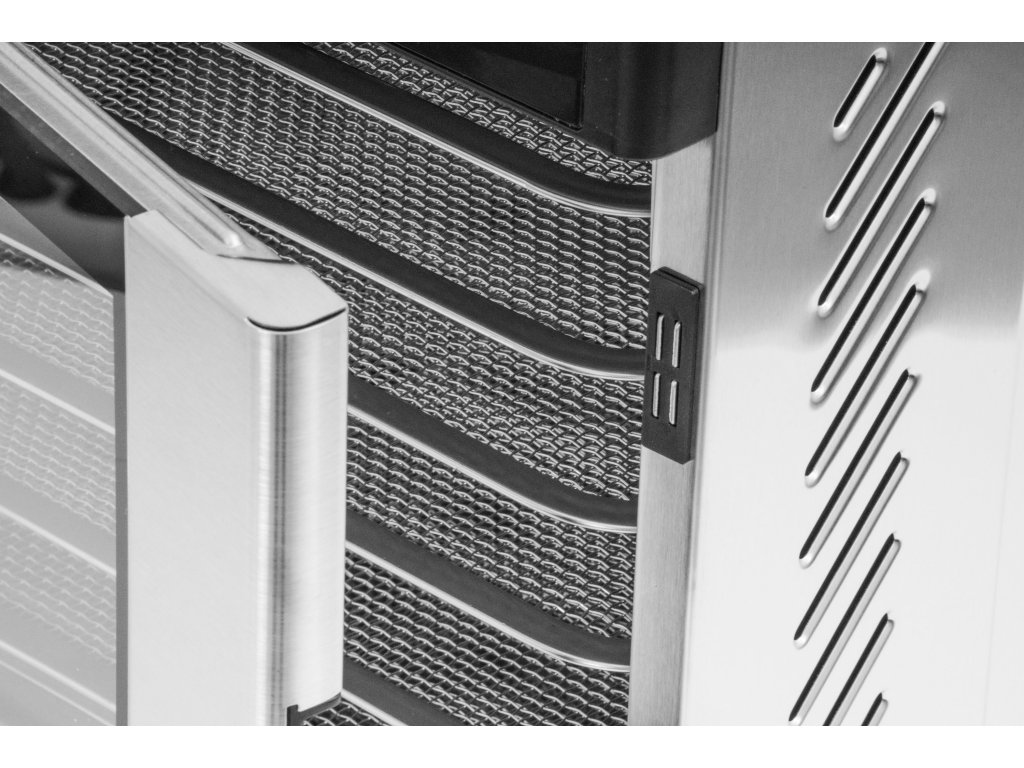 Sušička potravin G21 Mistral má na rozdíl od běžných sušiček také nerezová dvířka, která zajišťují nižší spotřebu energie, dokonalou cirkulaci vzduchu, efektivnější sušení a zkracují dobu sušení potravin. Abyste dvířka v průběhu sušení nemuseli otevírat a do sušičky se tak nedostal chladný vzduch, vybavili jsme je okénkem. Snadno a rychle tak zjistíte stav sušeného ovoce, zeleniny, bylinek, hub nebo masa. Díky dvířkům můžete také vyjmout libovolný počet plat a sušit na menším počtu bez obav, že narušíte kvalitu sušení.