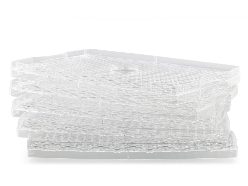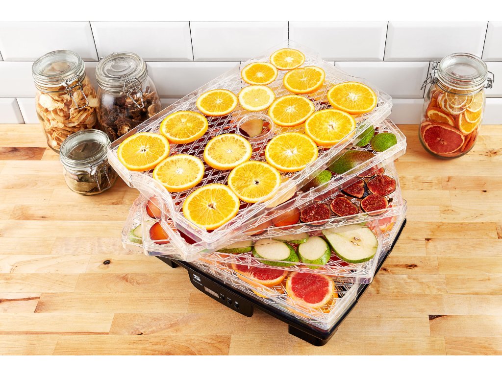 Usazení ventilátoru, výborně řešená sušící plata a navíc možnost jejich výškového nastavení garantuje rovnoměrné a rychlé sušení. Materiál sušících plat vám zase dopřeje jednoduché vyndání usušeného ovoce i zeleniny. Suroviny k platům nepřilnou, snadno je proto oddělíte.