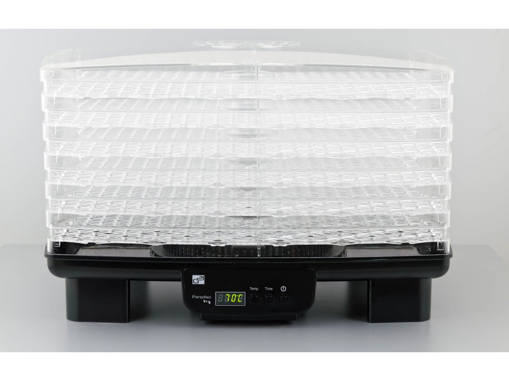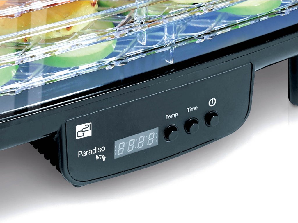 Teplotu sušení můžete zvolit v rozpětí od 40 do 70 °C. Doporučenou dobu sušení nastavíte na časovači, který díky funkci “automatické vypnutí” sušičku po stanovené době sám vypne. Nastavení i zbývající čas sušení můžete sledovat na digitálním displeji. Ovládání je proto velmi snadné a pohodlné. Sušičku G21 Paradiso Big skutečně hlídat nemusíte. Dělá to, co má. Suší.