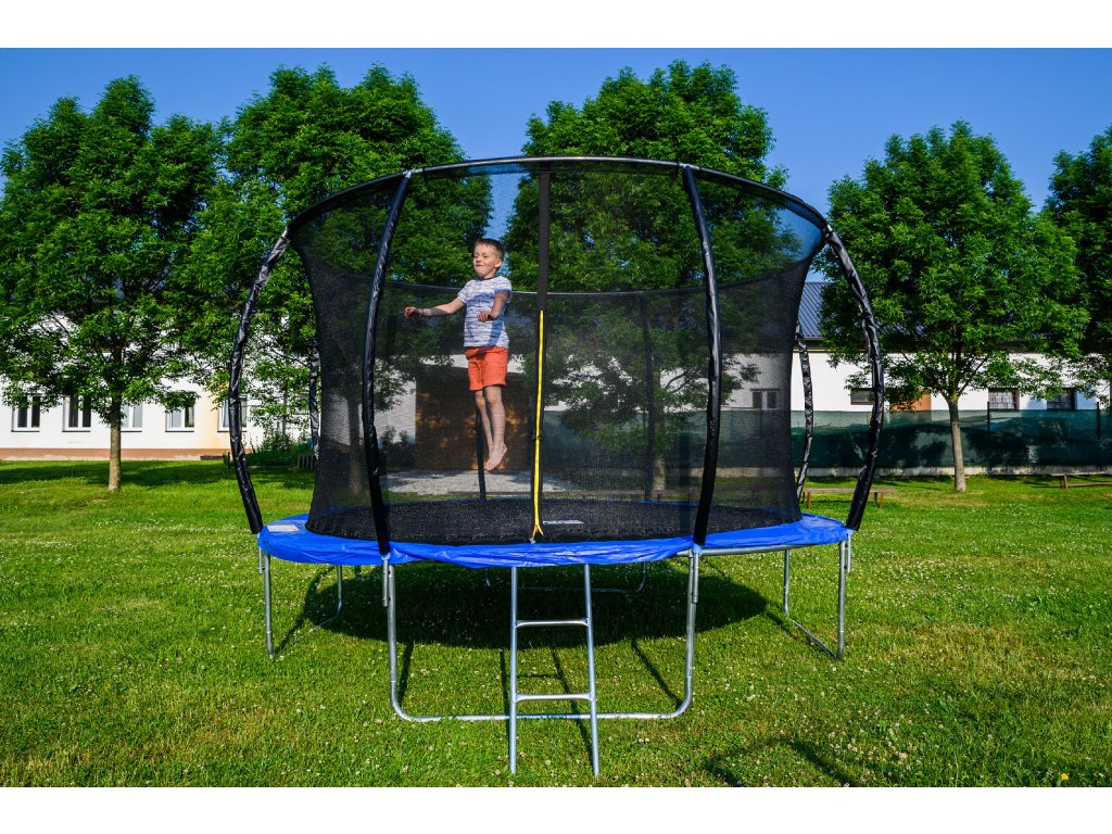 - Ochranná síť trampolíny je z vnitřní strany konstrukce, skákání na trampolíně je tak bezpečnější