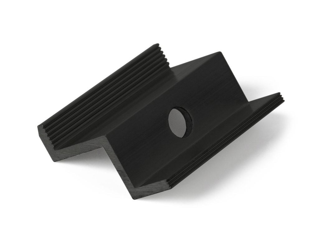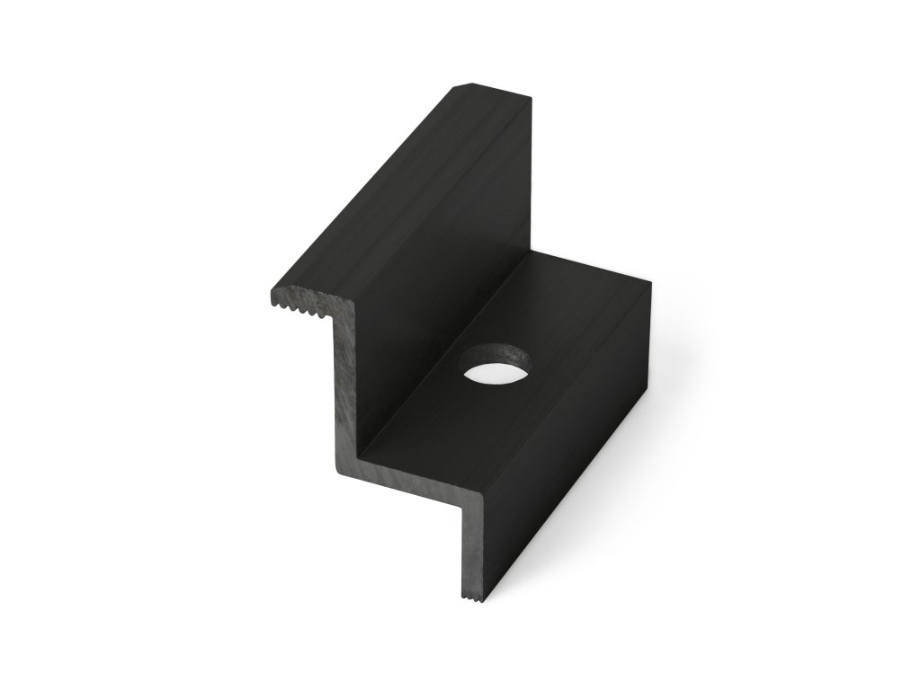 Krajní úchyt panelu, vhodný pro instalaci solárních panelů, určený pro upevnění panelu k hliníkovému profilu, otvor pro šroub M8. Černá barva.