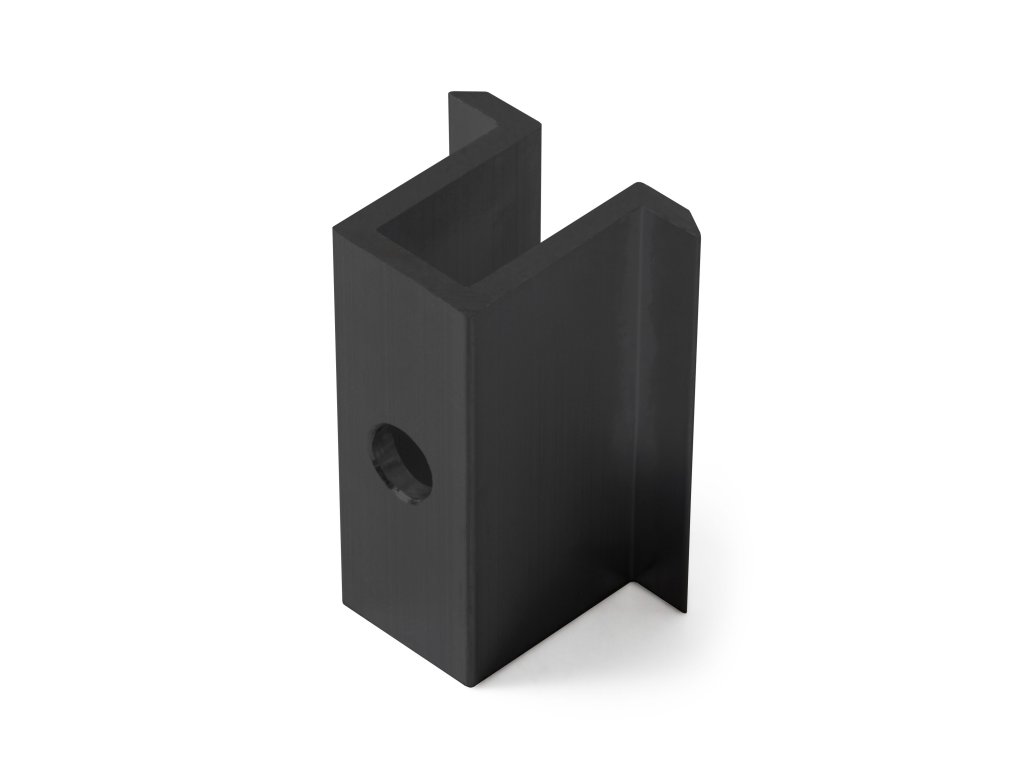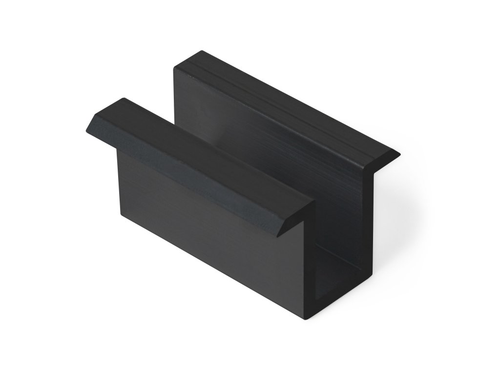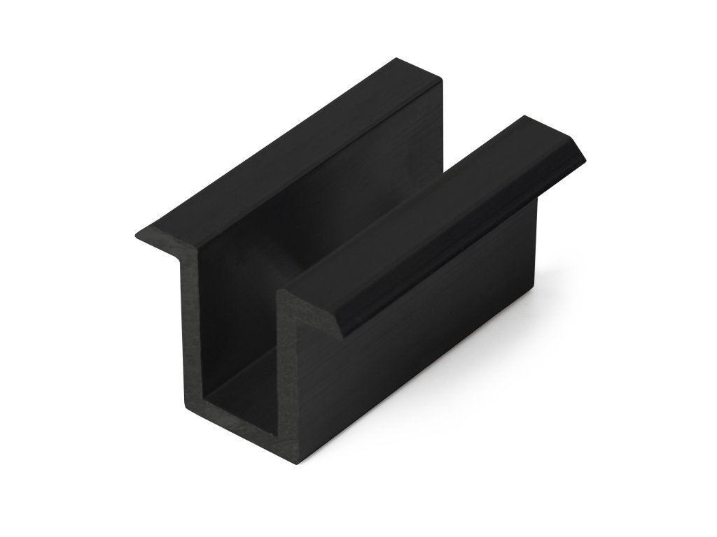Středový úchyt panelu, vhodný pro instalaci solárních panelů, určený pro upevnění panelu k hliníkovému profilu, otvor pro šroub M8. Černá barva.