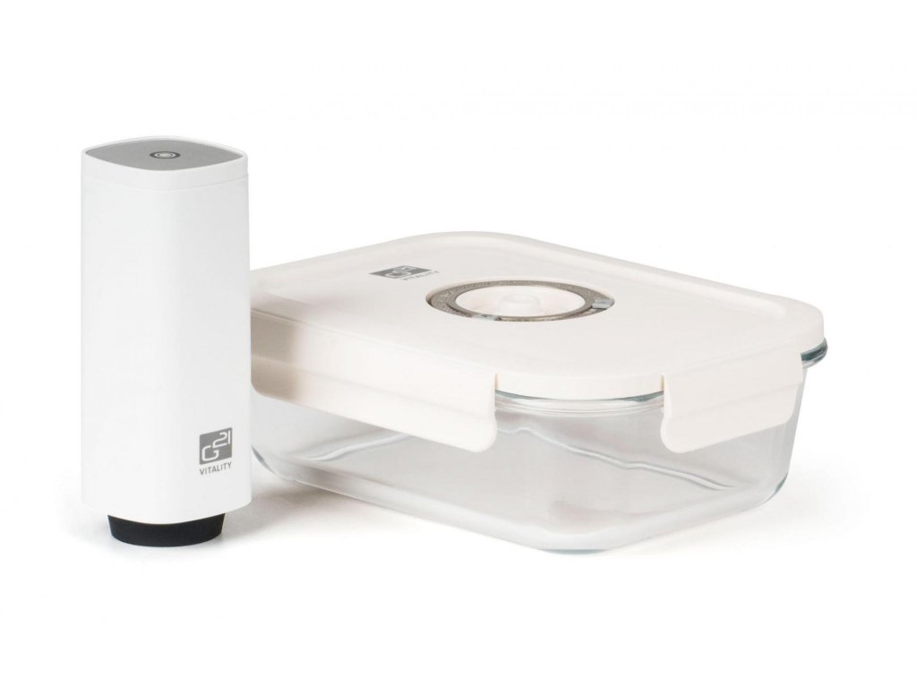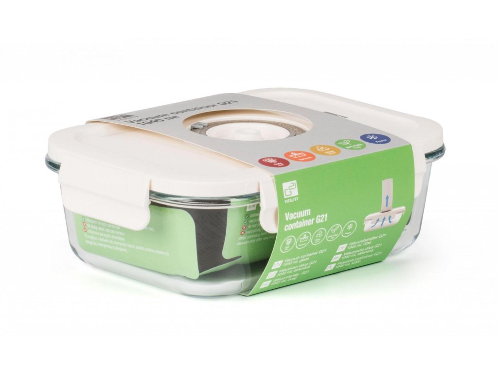 Pro pohodlné a snadné vakuování čerstvých i hotových potravin doporučujeme vynikající vakuovací dózu G21 s objemem 1 040 ml. Prodlouží trvanlivost potravin, zachová jim čerstvost i plnou chuť a vůni a především všechny zdraví prospěšné látky. Velkou výhodou této dózy je její široké využití – potraviny v ní po zavakuování můžete uložit do ledničky, zamrazit nebo po sundání víka rovnou zapékat v troubě či horkovzdušné fritéze.