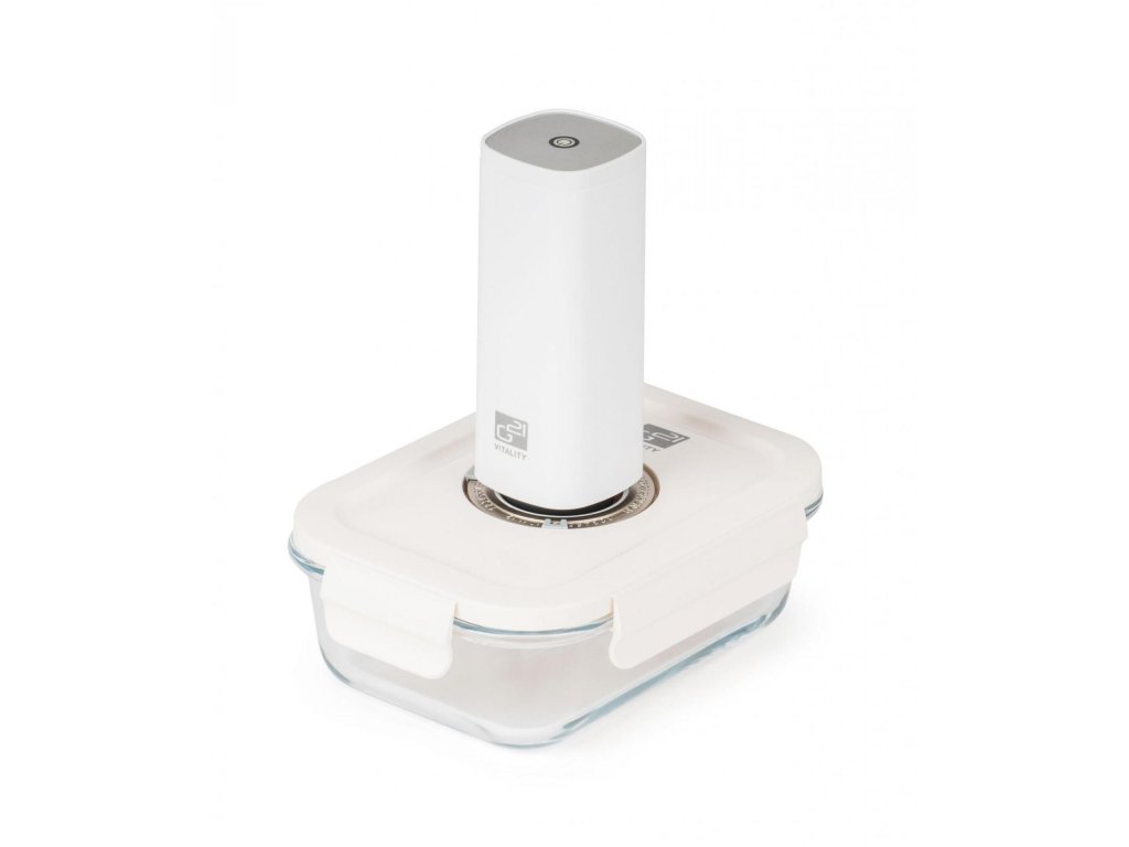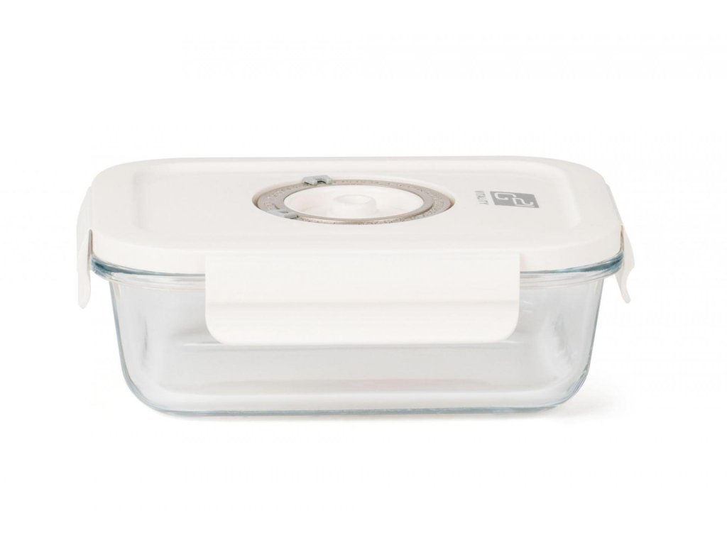 Plastové víko je vybaveno vakuovacím ventilem a praktickým nastavováním data. Budete tak vědět, kdy byly potraviny vakuovány nebo do kdy se mají spotřebovat. Ventil uprostřed víka lze jemně zmáčknout pro snadné uvolnění vakua.