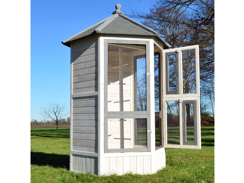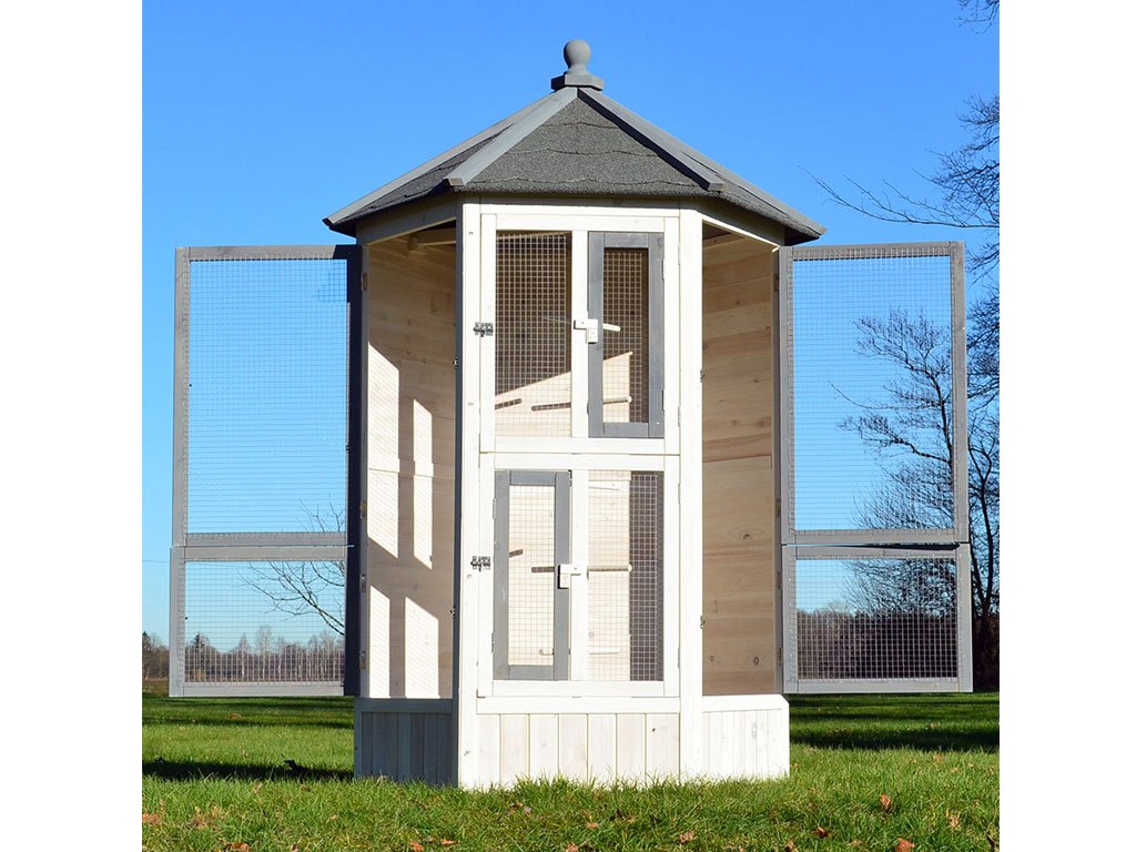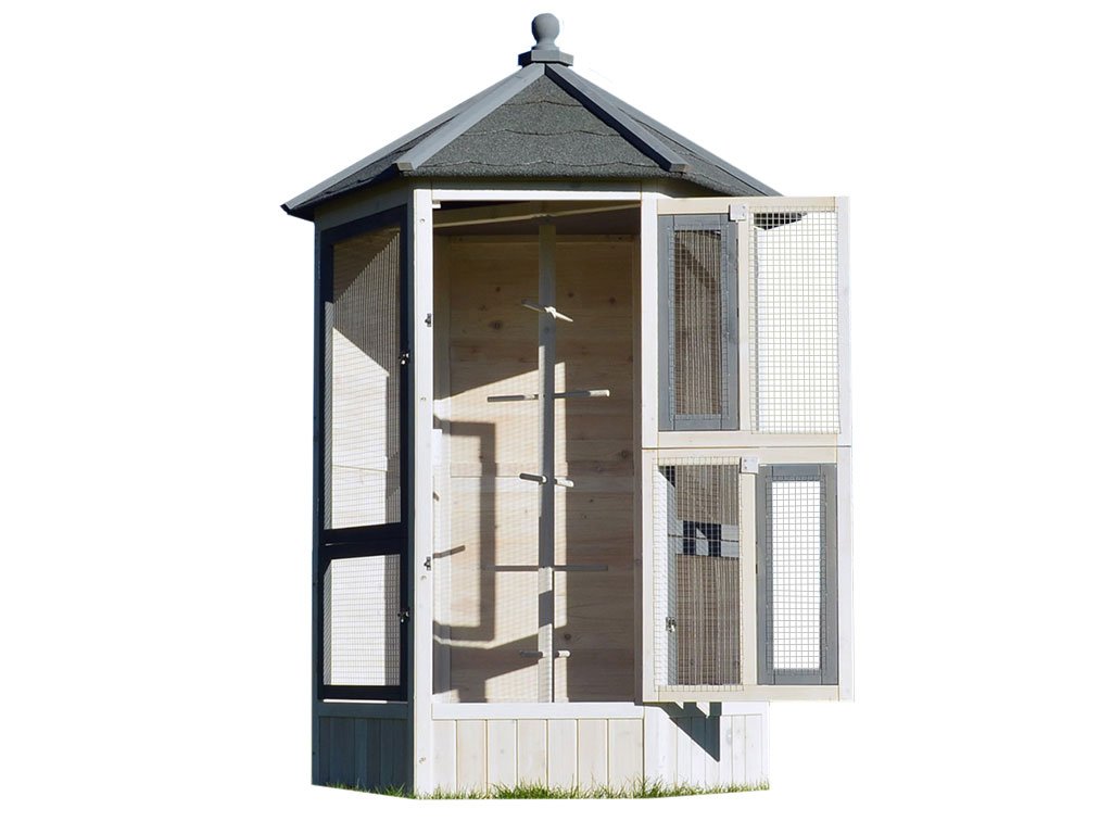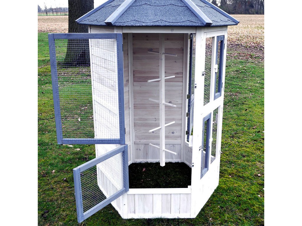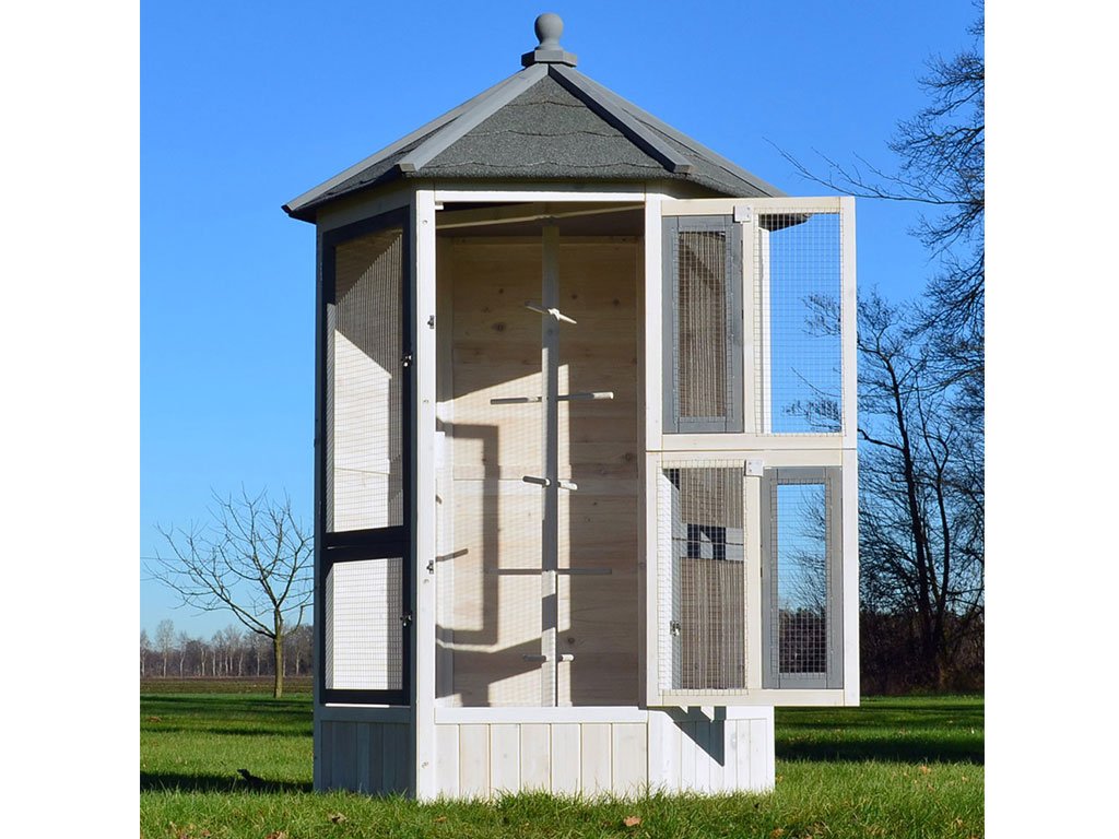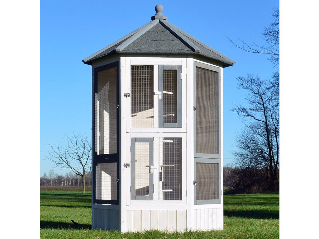 Voliéra pro ptáky z masivu, lakované borovicové dřevo, bitumenová střecha, 6 otevíratelných dvířek, 5 bidel na závěsné hrazdě, stylová bílá barva, rozměry 100x100x183cm.