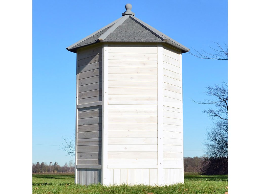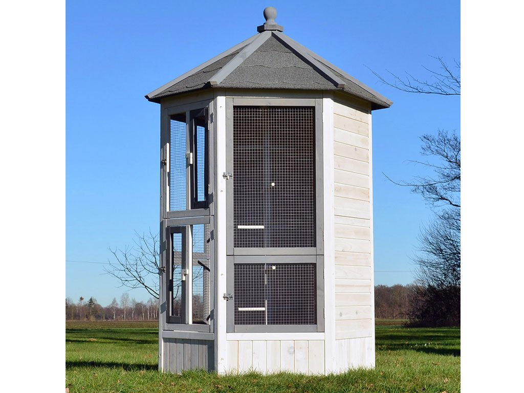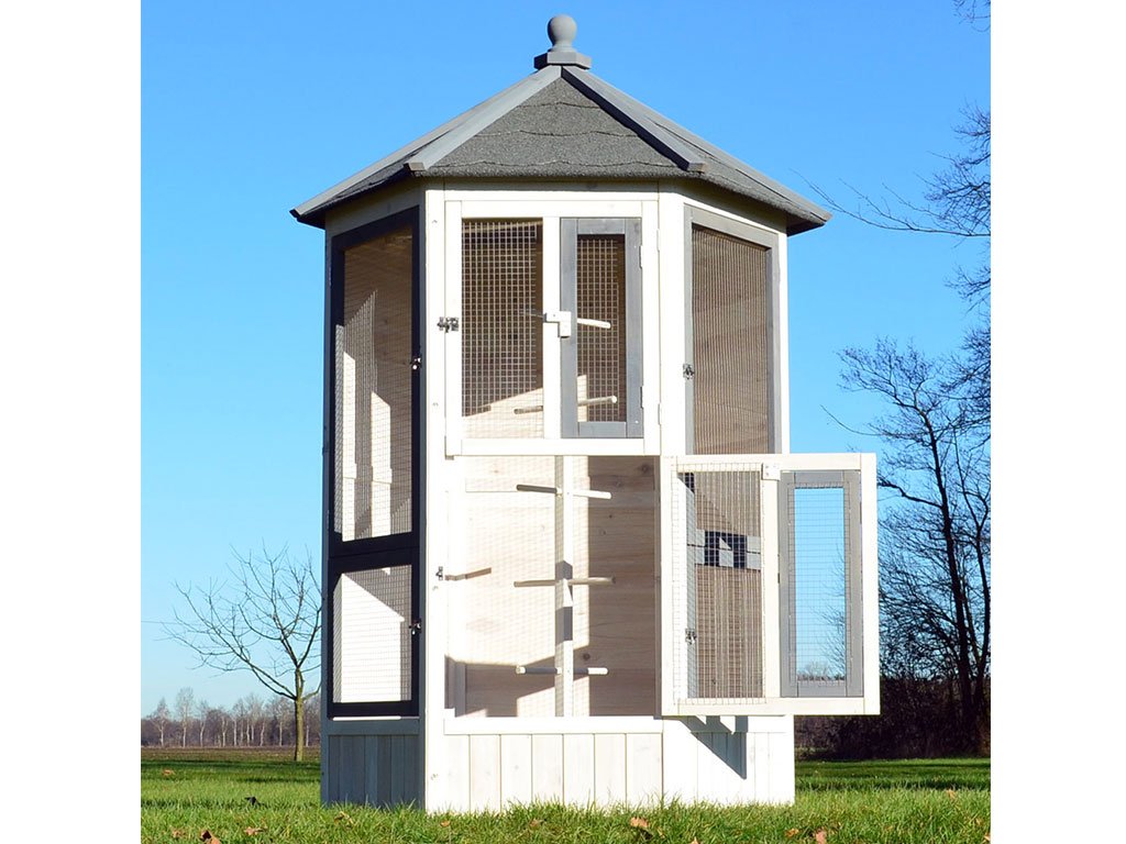 Voliéra pro ptáky z masivu, lakované borovicové dřevo v bílé barvě, 6 uzamykatelných dvířek, rozměry 100x100x183 cm. Pokud hledáte prostornou a stylovou voliéru pro ptáky, přesně takovou pro Vás máme. Voliéra z masivu, z odolného borovicového dřeva, je pevná a stabilní a navíc působí honosným dojmem. Dřevo je ošetřeno ochranným lakem v atraktivní bílé barvě. Vaši terasu nebo zahradu bude zdobit po mnoho let i díky odolné a nepromokavé bitumenové střeše. Voliéra má 6 dvířek, která lze otevírat společně nebo jednotlivě. Uvnitř klece najdete závěsnou hrazdu s 5 bidly, které poskytnou dostatek místa pro odpočinek i více ptákům.