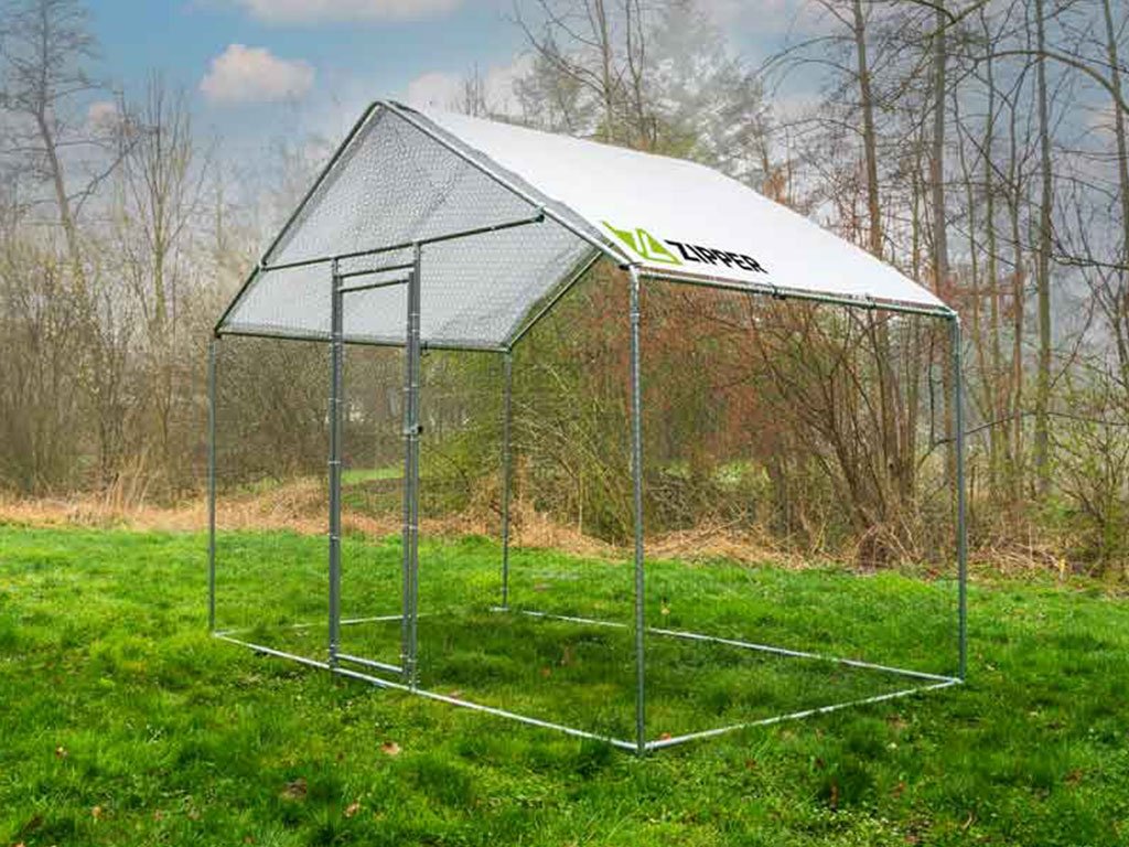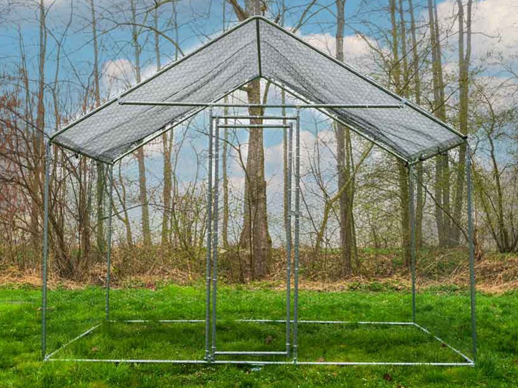 Výběh pro drůbež pozinkovaný, modulární zásuvný systém, pozinkované drátěné pletivo potažené PVC, velikost ok ohrady 45x25mm, velká vstupní branka, pozinkované trubky Ø25x0,65mm, ochranná plachta proti přímému slunci, rozměry 300x200x245cm.