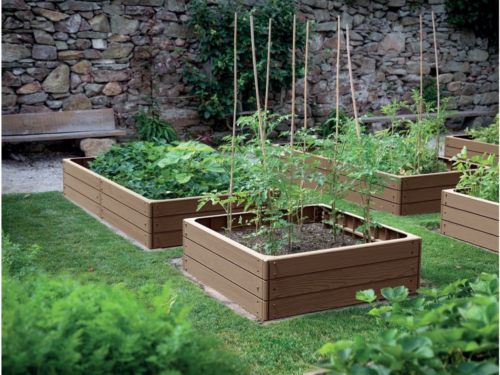 Pokud si pořídíte více těchto záhonů, můžete je stohovat na sebe. Pečujete o zasazené rostliny, aniž byste klečeli na zemi. Struktura vyvýšeného záhonu navíc napodobuje dřevo. Využijete ho tedy i jako dekorativní prvek na zahradu.