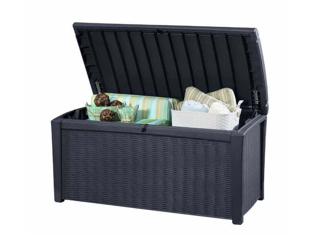 Díky zahradnímu boxu Keter Borneo získáte praktické úložné místo, kam schováte různé náčiní, dětské hračky nebo třeba i polštáře a deky. Ochráníte své věci před deštěm a jiným nepříznivým počasím a vždy je budete mít, kam uklidit. Box nabízí prostor o objemu 416 l a design imitující ratan v grafitové barvě nadchne každého vlastníka zahrádky, terasy nebo balkonu. Víko snadno otevřete s pomocí automatického mechanismu. Zavřený box můžete zároveň využít jako stolek nebo provizorní místo k sezení. Unese až dva dospělé lidi.