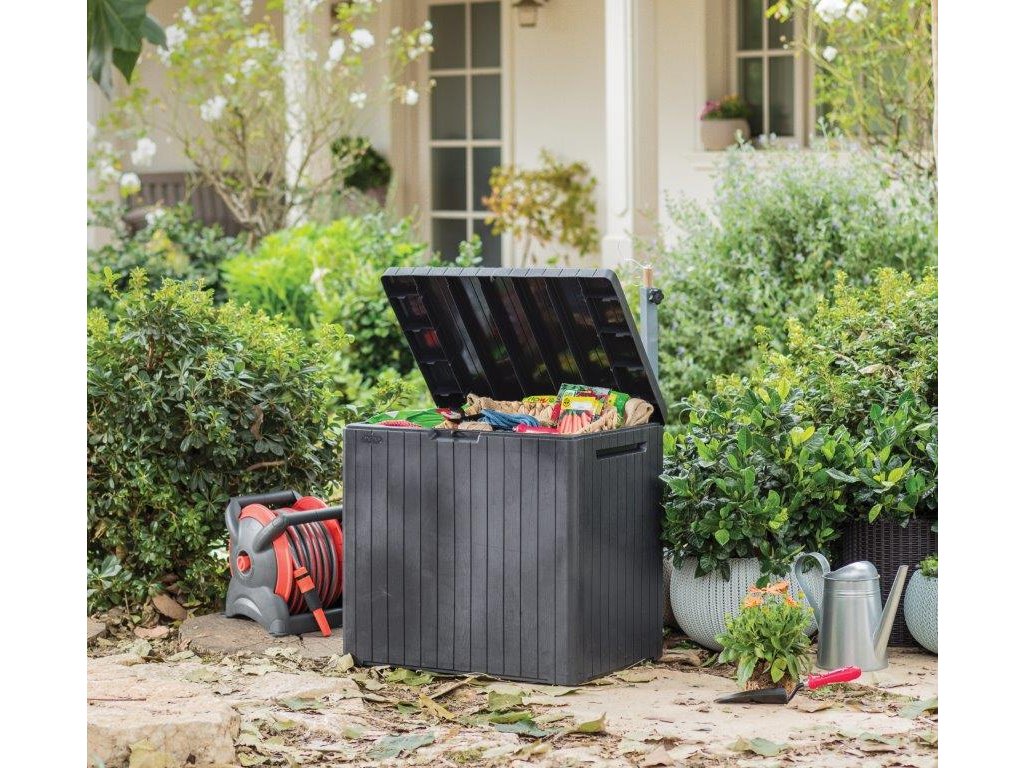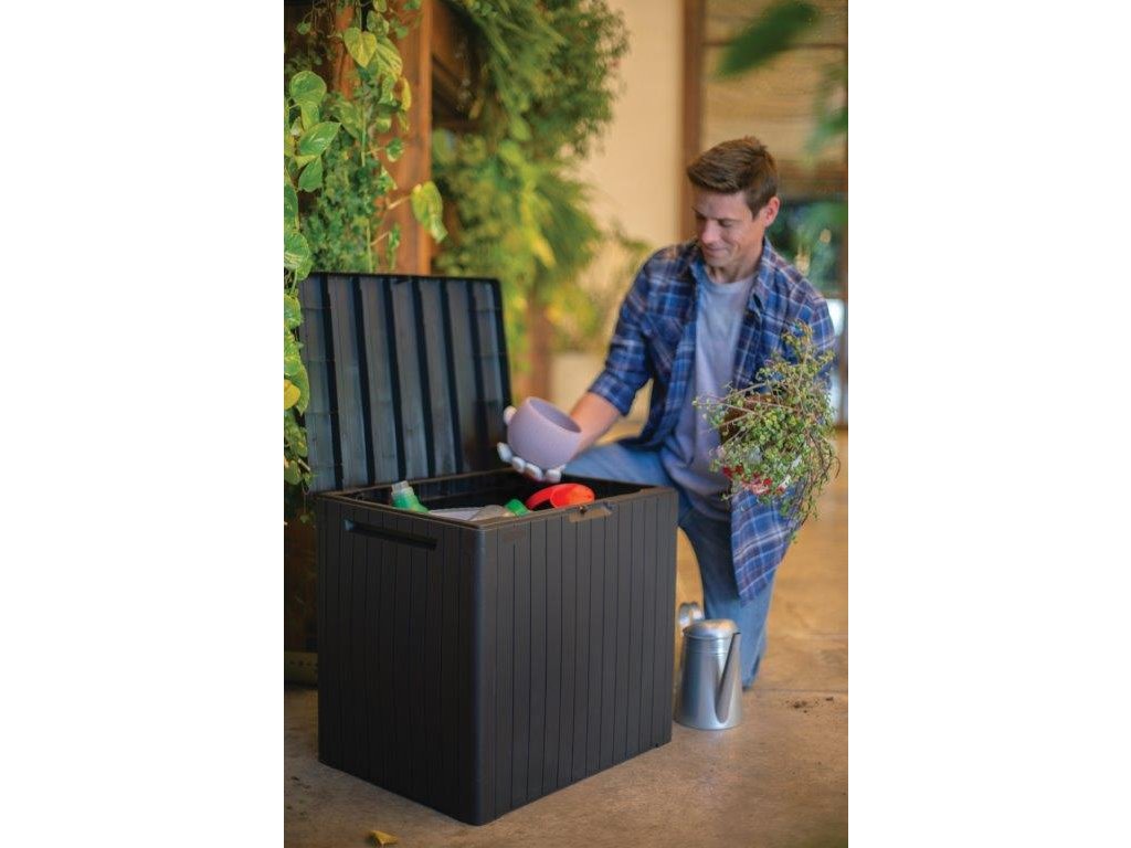 Úložný zahradní box City Storage značky Keter v grafitové barvě má kapacitu 113 litrů. Svým designem připomíná přírodní dřevěné palubky. Skvěle tak doplní jak moderní, tak i tradiční look okolí. Velkou výhodou boxu je jeho nízká hmotnost a voděodolnost.