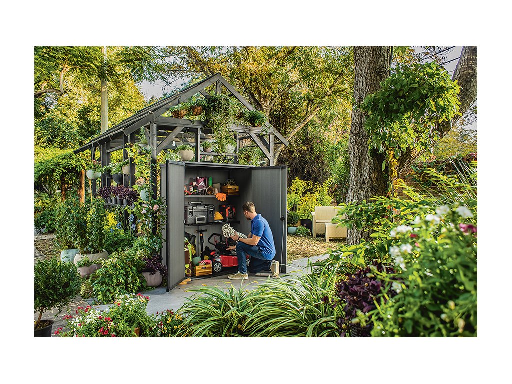 Zahradní box Keter Cortina Alto rozšíří úložný prostor na vaší zahradě, na dvoře či v pergole. Uschováte v něm sportovní vybavení, zahradní nářadí, sekačku na trávu a jiné potřeby. Ochráníte své věci před povětrnostními vlivy, jako je například déšť. Kromě toho jsou uložené předměty v bezpečí i před nečistotami a vlhkostí.