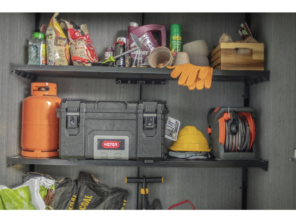 Zahradní box je vybavený dvojitými dvířky s klikou. Snadno a bez přebytečné námahy dovnitř umístíte i větší předměty. Menší věci přehledně uspořádáte na 2 police (součástí balení). Abyste všechno uchovali v bezpečí, dá se box uzamknout pomocí visacího zámku (není součástí balení).