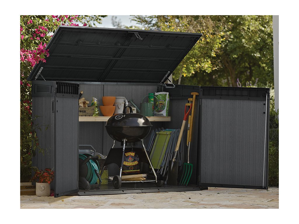 Zahradní box je vybavený dvojitými dvířky a vyklápěcím víkem. Snadno a bez přebytečné námahy dovnitř umístíte i větší předměty. Abyste je uchovali v bezpečí, dá se box uzamknout pomocí visacího zámku (není součástí balení). Pokud se vám provedení boxu nelíbí, můžete ho klidně natřít jinou barvou.