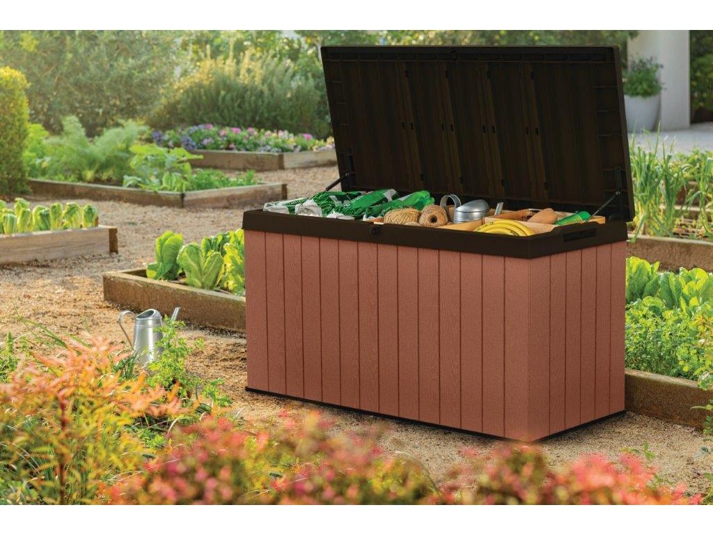 Najděte pro box ideální místo na zahradě. Díky struktuře, která připomíná dřevo, zapadne do každého prostředí. Uložené věci navíc můžete uzamknout uvnitř boxu. Hydraulický pístový systém zajistí plynulé a bezpečné zavírání a otevírání víka. Po zavření se na něj navíc usadí až 2 lidi.