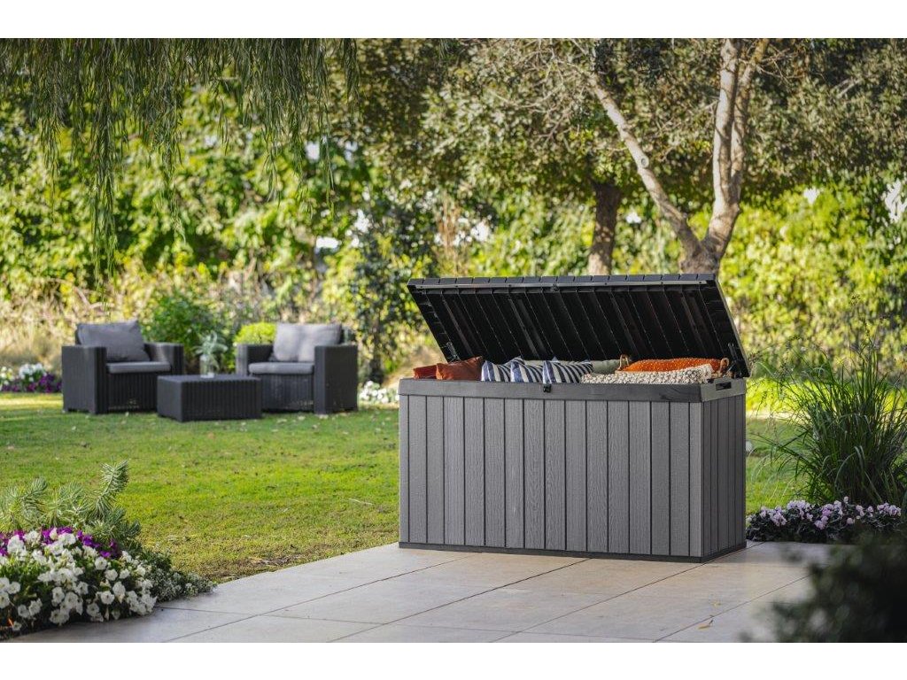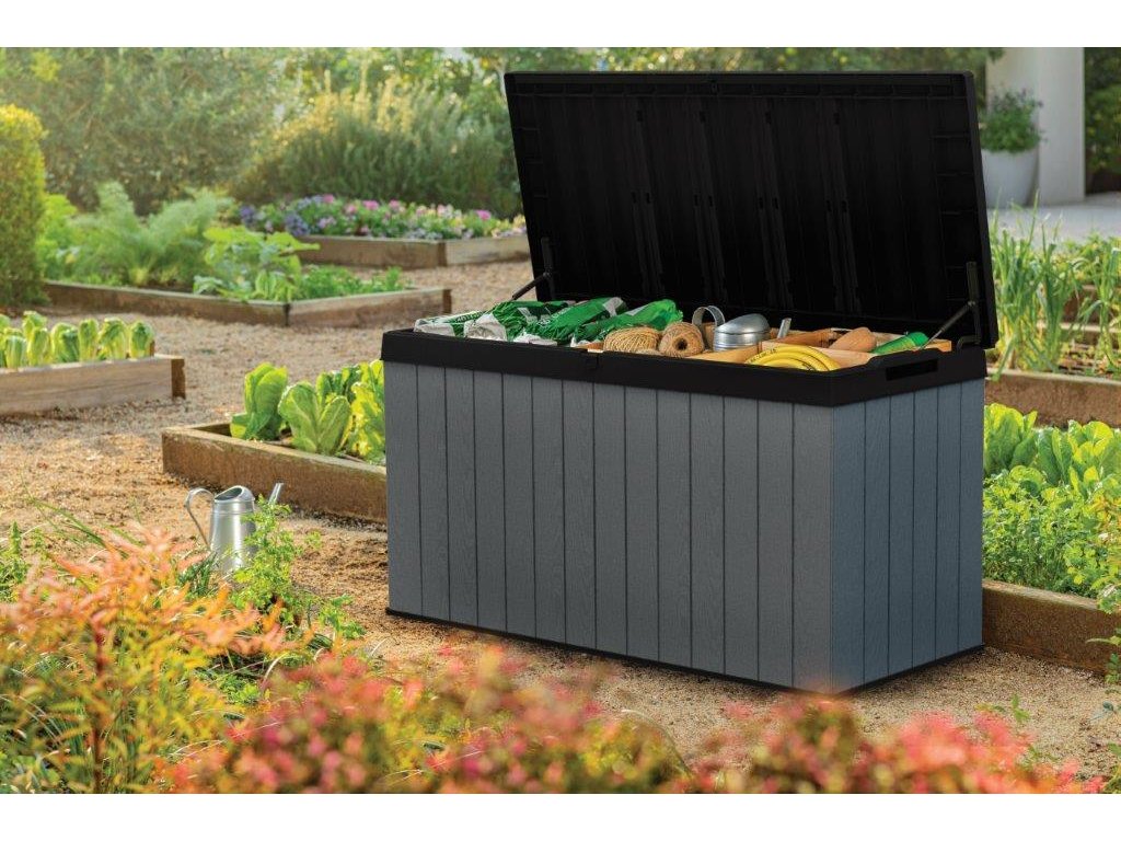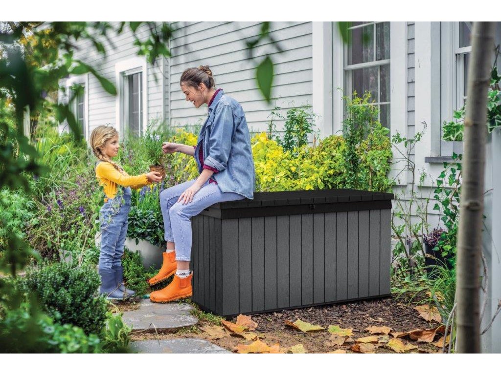 Najděte pro box ideální místo na zahradě. Díky struktuře, která připomíná dřevo, zapadne do každého prostředí. Uložené věci navíc můžete uzamknout uvnitř boxu. Hydraulický pístový systém zajistí plynulé a bezpečné zavírání a otevírání víka. Po zavření se na něj navíc usadí až 2 lidi.