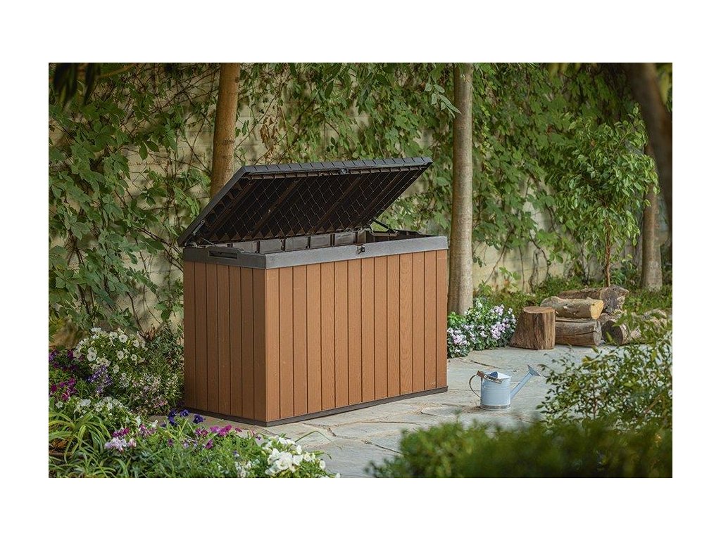 Najděte pro box ideální místo na zahradě. Díky struktuře, která připomíná dřevo, zapadne do každého prostředí. Uložené věci navíc můžete uzamknout uvnitř boxu. Hydraulický pístový systém zajistí plynulé a bezpečné zavírání a otevírání víka. Po zavření se na něj navíc usadí až 2 lidi.