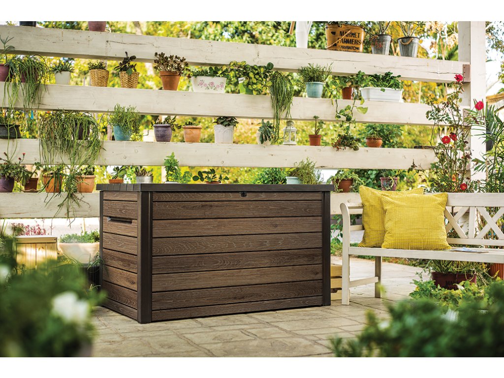 Najděte pro box ideální místo. Díky struktuře, která připomíná dřevo, zapadne téměř do každého prostředí. Abyste uložené předměty uchovali v bezpečí, dá se box uzamknout pomocí visacího zámku (není součástí balení). Hydraulický pístový systém zajistí plynulé a bezpečné zavírání a otevírání víka. Po zavření se na něj navíc usadí až 2 lidi.