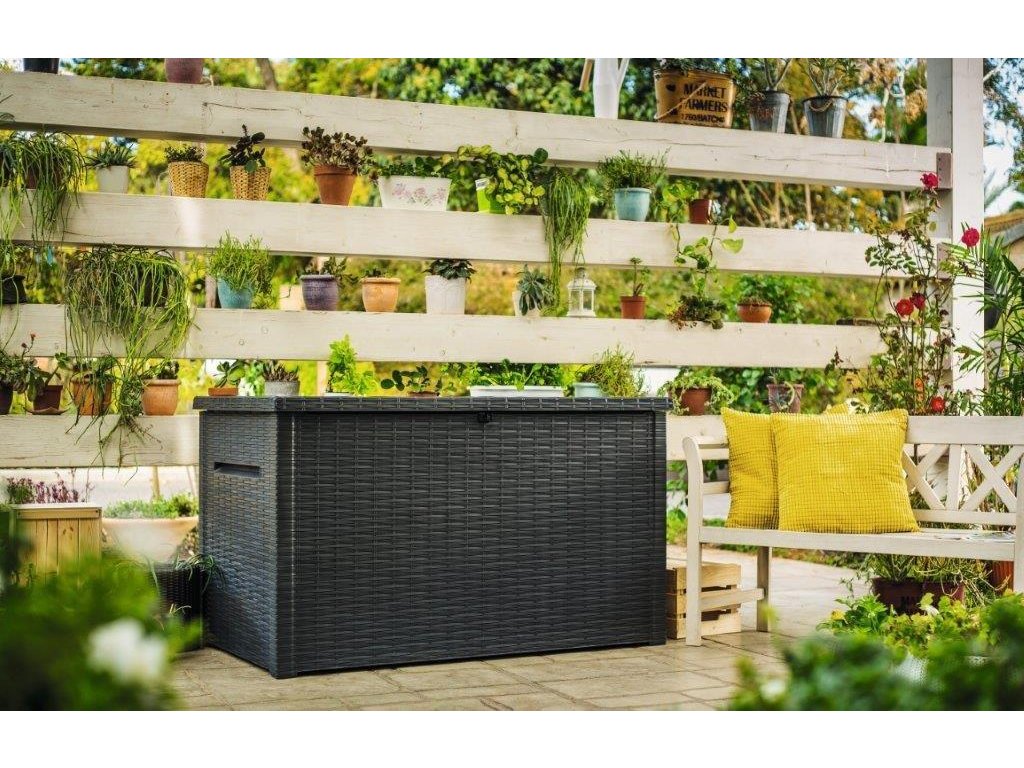 Ratanová imitace v moderní grafitové barvě. Úložný prostor 137 x 56 x 63 cm, kapacita 870 l, 50kg nosnost. Podlahový panel chrání proti vodě, bahnu, prachu a dalším nečistotám, vyztužení žebrovými segmenty. Polypropylenová pryskyřice.