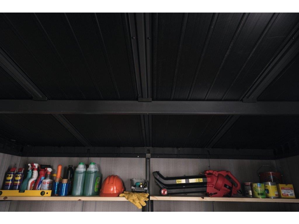 Keter Artisan 7x7 má dvojité dveře s uzamykacím systémem z ušlechtilé oceli, díky němuž se do domku nedostane nikdo neoprávněný (visací zámek není součástí této dodávky). Samozřejmostí jsou také rozměrná okna, která do domku vnesou přirozené denní světlo. Rovněž zde nechybí ventilační mřížka, která zase obstará lepší cirkulaci vzduchu, čímž zatočí s vlhkostí, s plísní a s hnilobou jednou provždy. Masivní pultová střecha nabízí maximální nosnost až 200 kg/m2, tudíž s přehledem unese i větší nánosy sněhu bez jakýchkoliv bezpečnostních rizik. Pomocí systému D-Clip můžete na vnitřní stranu stěn pohodlně umístit různé regály a organizéry nebo si zavěsit jízdní kolo či pracovní náčiní s násadou tak, abyste ušetřili co nejvíce prostoru pro další příslušenství.
