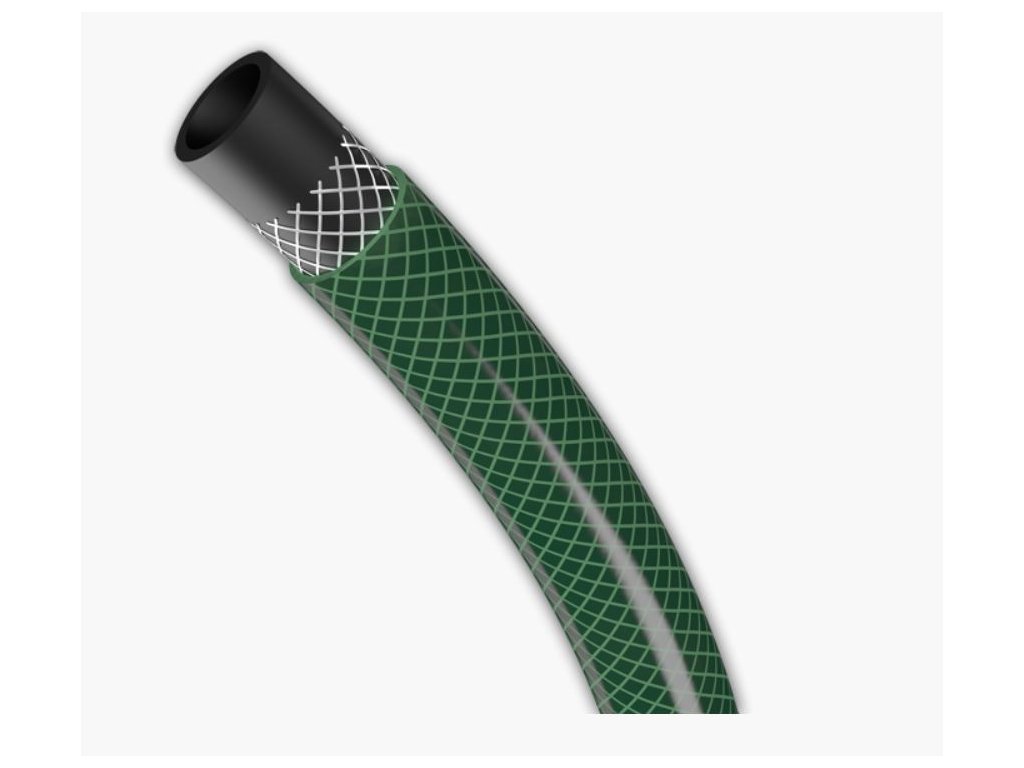Vnitřní černá vrstva zabraňuje tvorbě řas a zajišťuje ochranu proti UV. Střední vrstva ze syntetických vláken dává hadici vysokou tlakovou odolnost. Vnější hladká vrstva dodává vysokou odolnost proti otěru, hadice lépe klouže po terénu a zajišťuje perfektní vlastnosti při použití v náročnějších podmínkách jako je přímý kontakt s hustými keři a podobně. Délka hadice je 15 m. Barva neprůhledná zelená.