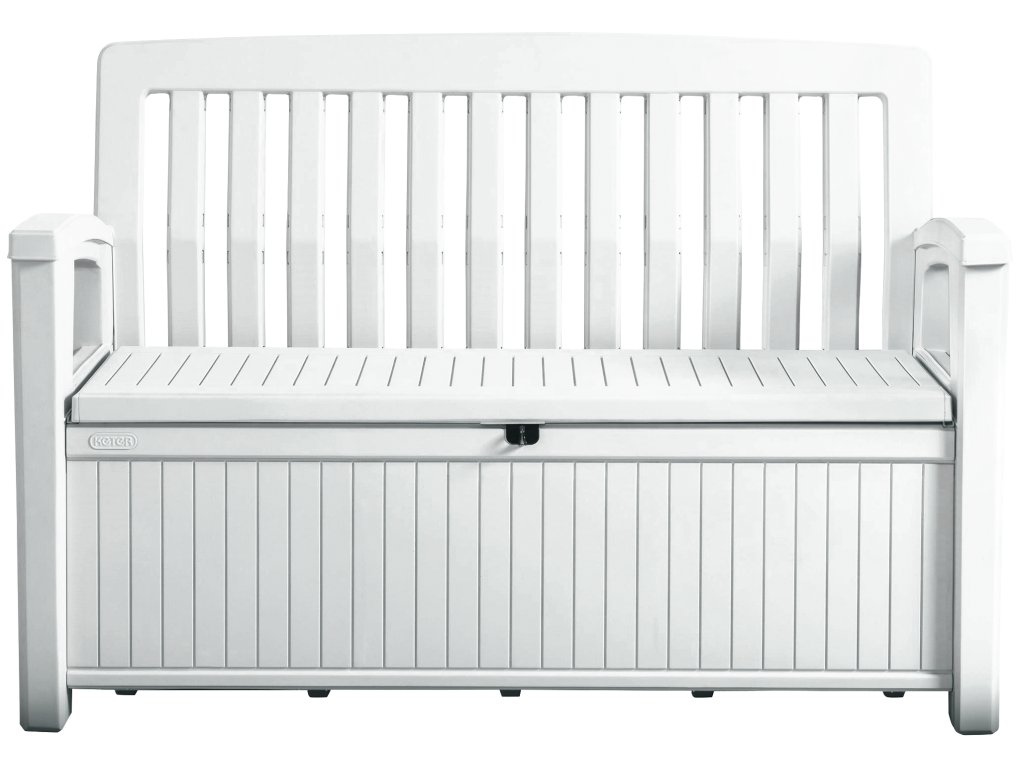 Zahradní lavička s uzamykatelným úložným prostorem o objemu 227 l, bílá barva, povrch imitující dřevo. Odolnost vůči UV záření a povětrnostním podmínkám, jednoduchá montáž a snadná údržba. 2místná, nosnost 2 x 110 kg. Kvalitní a pohodlná.