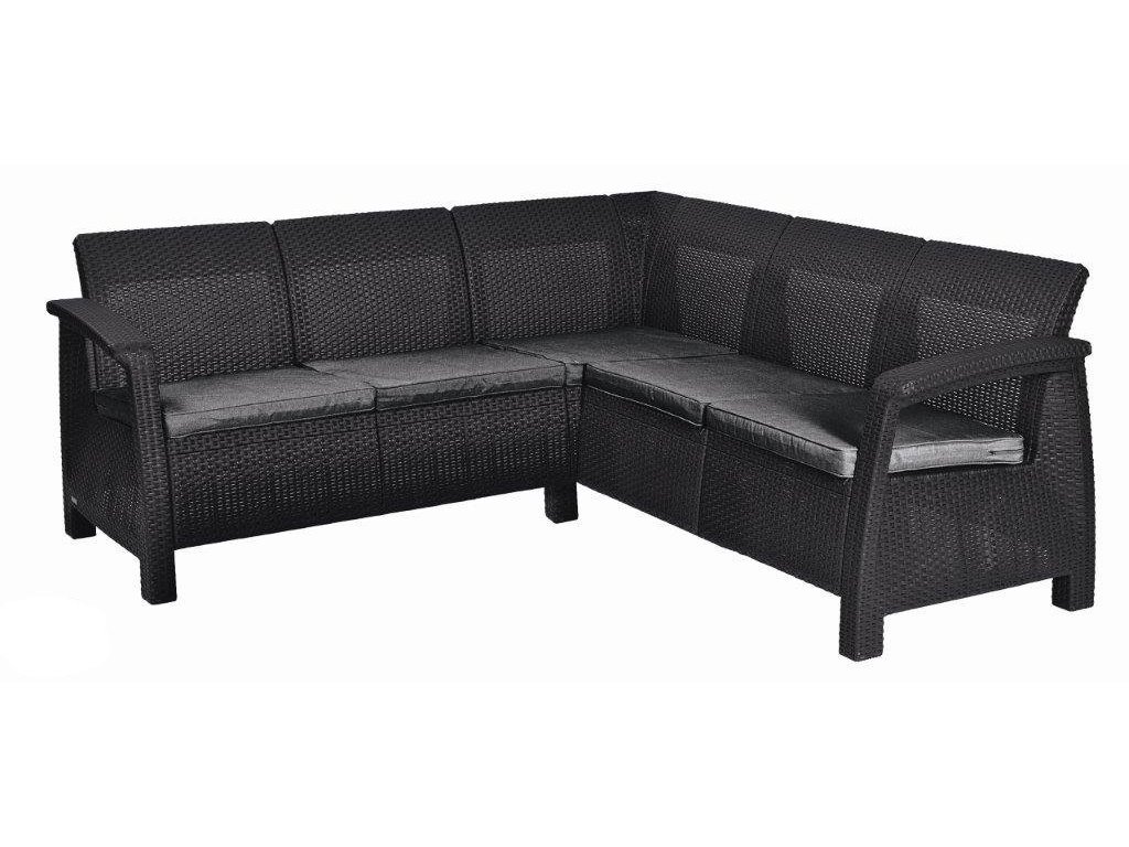 Zahradní pětimístná rohová pohovka Corfu nejoblíbenější řady nábytku od Keteru v grafitové barvě vás nadchne svým nevšedním designem v imitaci přírodního ratanu. Konstrukce je přitom pevná a vydrží běžné zatížení venkovního provozu.