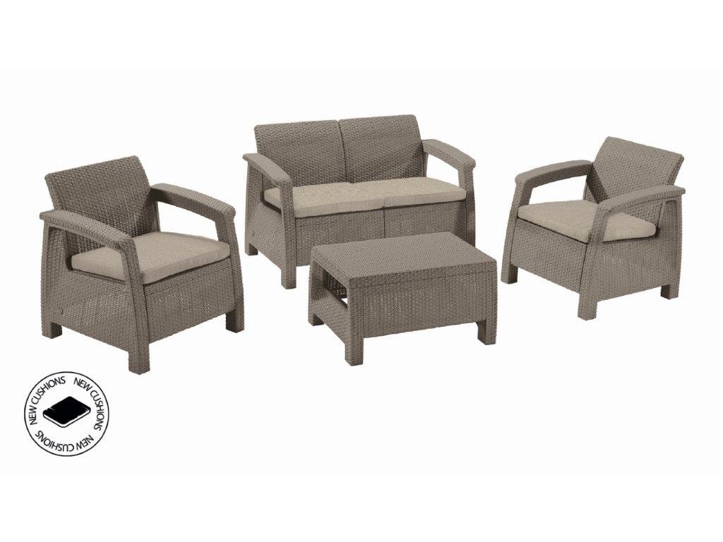 Set zahradního nábytku Corfu z nejoblíbenější řady nábytku od Keteru připomíná svým designem přírodní ratanovou vazbu. Skvěle tak doplní jak moderní, tak i tradiční look okolí. Užijte si pohodlí díky měkkým sedákům.