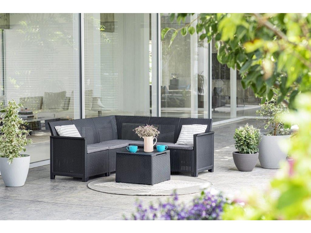 Díky nábytku Keter Elodie si na zahradě, terase, v pergole či na balkoně vytvoříte krásné a pohodlné posezení. Připravíte se na slunečné dny, které strávíte u kávy na čerstvém vzduchu, nebo pozvete na návštěvu své příbuzné a přátele. Sada obsahuje rohovou sedačku a stolek s praktickým úložným prostorem. Do něj můžete uchovat například podsedáky. Celkově vám poskytne 5 míst k sezení.