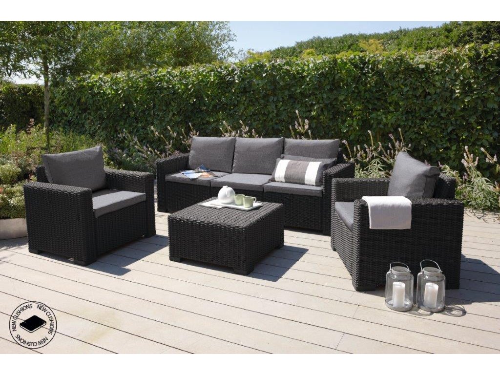 Stolek v imitaci přírodního ratanu v grafitové barvě tvoří rodinu s křeslem a pohovkami (2místná a 3místná) setu Califonia lounge. Důmyslná technologie zaručuje tu nejsnadnější možnou montáž. Konstrukce z umělé pryskyřice vyniká odolností vůči počasí.