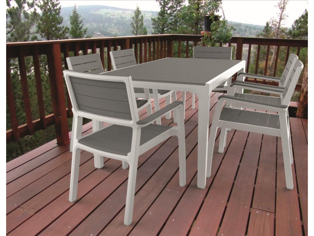 Harmony stůl s bílým rámem a šedými prkny připomínajícími dřevo tvoří dokonalý pár s pohodlnými židlemi stejné řady. Nekovový rám je odolný vůči rzi a je zárukou snadné údržby. Konstrukce z umělé pryskyřice. Bílo-šedá barva.