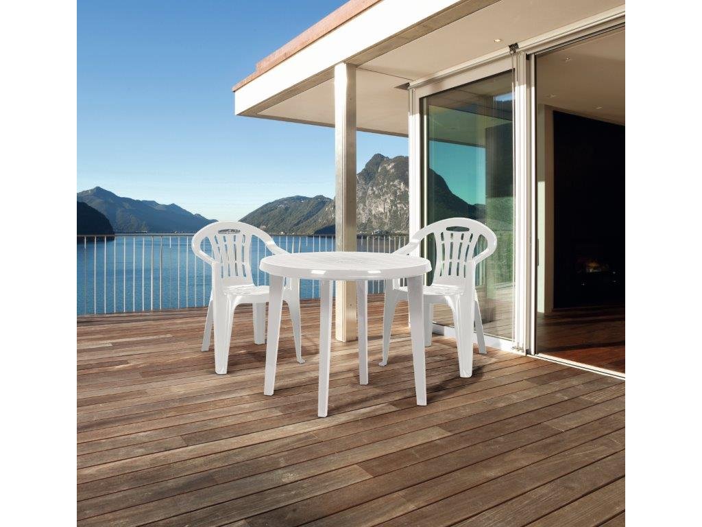 Jednoduchý a praktický kruhový plastový stůl o průměru 90 cm v elegantní bílé barvě skvěle poslouží na každé terase, pod pergolou, k posezení u bazénu nebo kdekoliv jinde. Duté nohy lze naplnit pískem. Otvor pro slunečník.