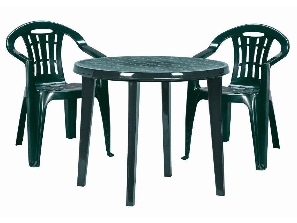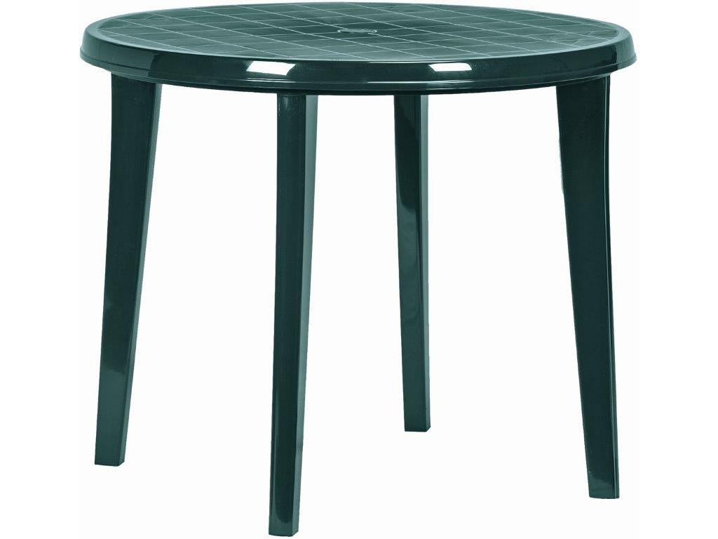 Praktický kruhový stůl o průměru 90 cm v tmavě zelené barvě, kvalitní plast odolný proti UV záření a povětrnostním vlivům, velmi snadná údržba - postačí vám k tomu mokrý hadřík a trochu čisticího prostředku, jednoduchá montáž, otvor na slunečník.