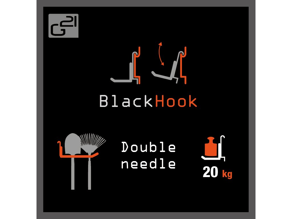 Univerzální držák na nářadí G21 BlackHook double needle se používá k zavěšování sportovního a zahradního náčiní a je součástí komplexního závěsného systému G21. Držák disponuje dvěma háčky s délkou 20 cm. Má nosnost 20 kg a rozměry 7,6 x 10 x 22 cm.