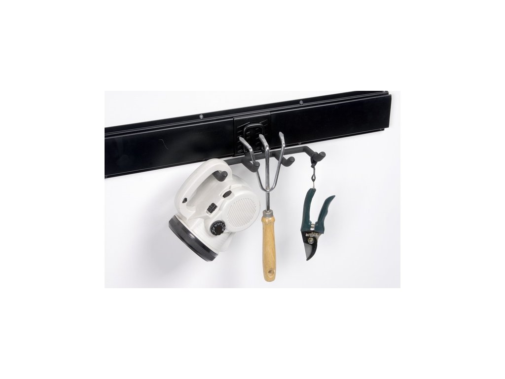 Držák na nářadí je jednoduchý na připevnění a umožní bezpečné zavěšení téměř každého druhu nářadí. Je opatřen gumovým návlekem a zavěšuje se na závěsnou lištu s rozměrem 61 x 10 cm, kterou lze spojovat spojnicí a zakončit plastovou záslepkou.
