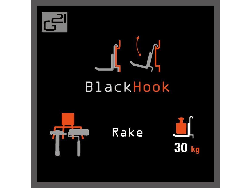 Univerzální držák na nářadí G21 BlackHook rake se používá k zavěšování sportovního a zahradního náčiní a je součástí komplexního závěsného systému G21. Držák disponuje čtyřmi háčky s délkou 9 cm. Má nosnost 30 kg a rozměry 21,5 x 10 x 13 cm.